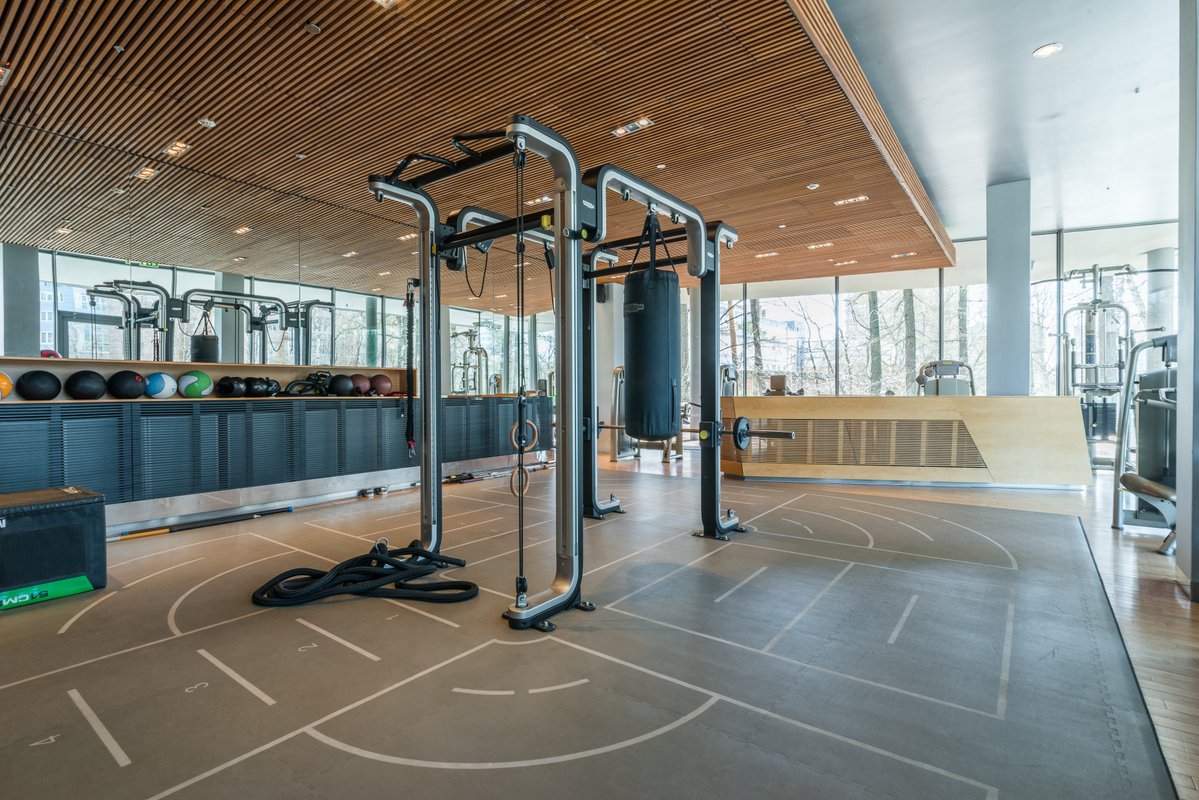 Современный и стильный зал. Отличные зоны для отдыха и тренировок. Поддерживающая атмосфера, заряжает на работу над собой